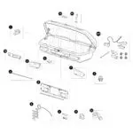| Onderdelen | 1. Lid lifter, 2. Lock strip, 3. License plate holder 520x110mm, 4. Cable clip, 6. MtgBag Lampcover L, 7. MtgBag Lampcover R, 8. Rubber spring kit, 9. Drain plug, 10. Screw + Washer, 11. Rivet Plug-Black, 12. Logo, 13. Strap 2.20 m long, 14. Lockbar handle cover left |